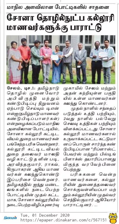 Sona student innovators won the prize in TNSI-2019 Competition at State level