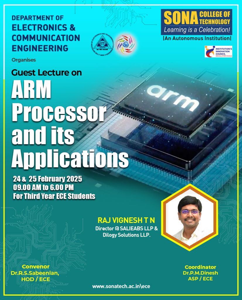 The Department of ECE organized a Guest Lecture titled “ARM Processor and its Applications” on 24.02.2025 & 25.02.2025 at Dr.APJ Abdul Kalam Hall, with Mr. T. N. Raj Vignesh, Director – Salieabs LLP and Dilogy Solutions LLP, as the resource person. He highlighted the pivotal role of ARM processors in driving modern embedded systems and their widespread applications across domains such as mobile devices, automotive systems, industrial automation, and IoT solutions. The session emphasized the architectural advantages of ARM processors, including low power consumption, scalability, and high performance, which make them a preferred choice for industry applications. Students actively engaged with the speaker, asking questions about real-time applications, career prospects, and strategies to enhance their expertise in processor architectures. Overall, the guest lecture was highly informative and inspiring, motivating students to strengthen their technical foundation and explore career pathways in ARM processor-based embedded solutions with confidence and industry readiness.