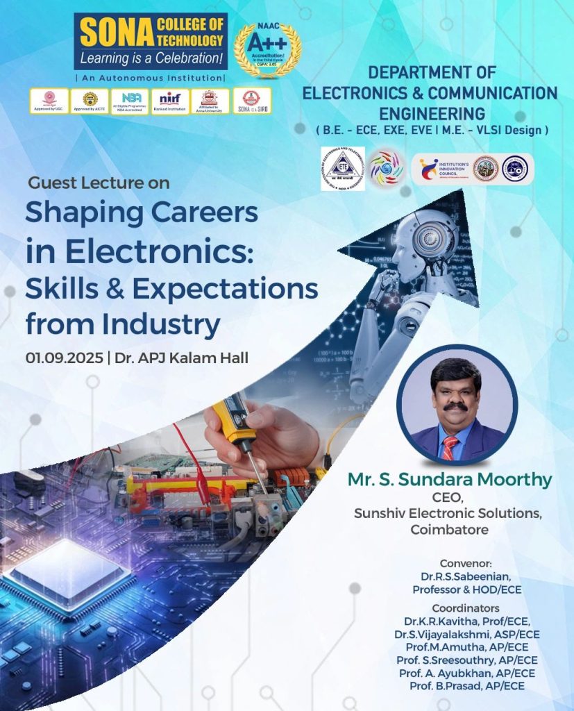 The Department of ECE organized a Guest Lecture titled “Shaping Careers in Electronics: Skills and Expectations from Industry” on 01.09.2025 at Dr. APJ Abdul Kalam Hall, with Mr. S. Sundaramoorthy, CEO, Sunshiv Electronic Solutions, Coimbatore, as the resource person. He highlighted the vast career opportunities in the electronics sector and stressed the importance of developing the right skill sets to meet industry demands. The session emphasized core knowledge areas such as circuit design, embedded systems, testing, and product development, along with the growing need for innovation and adaptability. Insights were shared on challenges faced in the electronics domain and strategies for students to strengthen their employability. Students actively engaged with the speaker, clarifying their doubts on career planning, industry trends, and entrepreneurial opportunities. The lecture provided valuable guidance on bridging the gap between academic learning and industry requirements. Overall, it proved highly beneficial and motivational, inspiring students to shape their careers in electronics with confidence and industry readiness.