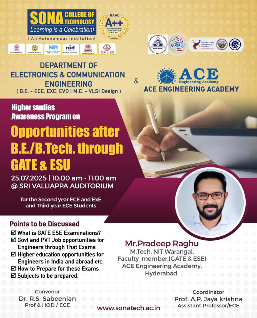 The Department of ECE organized a Higher Studies Awareness Program titled “Opportunities after B.E./B.Tech. through GATE&ESU” on 25.07.25 in Sri Valliappa Auditorium. The session was handled by Mr Pradeep Raghu, who is currently the Faculty Member, ACE Engineering Academy, Hyderabad. The resource person spoke on various GATE exam prerequisites, including exam preparation strategies, along with its role in today’s Government job sectors, along with some of the previous year statistics for the same. He shared information about the possible ways of improvising the students’ preparation methods and their associated approaches in helping students for the same, the various core government jobs they can take up, and how these skills developed by the students will be useful to the students in real life industry aspects.
