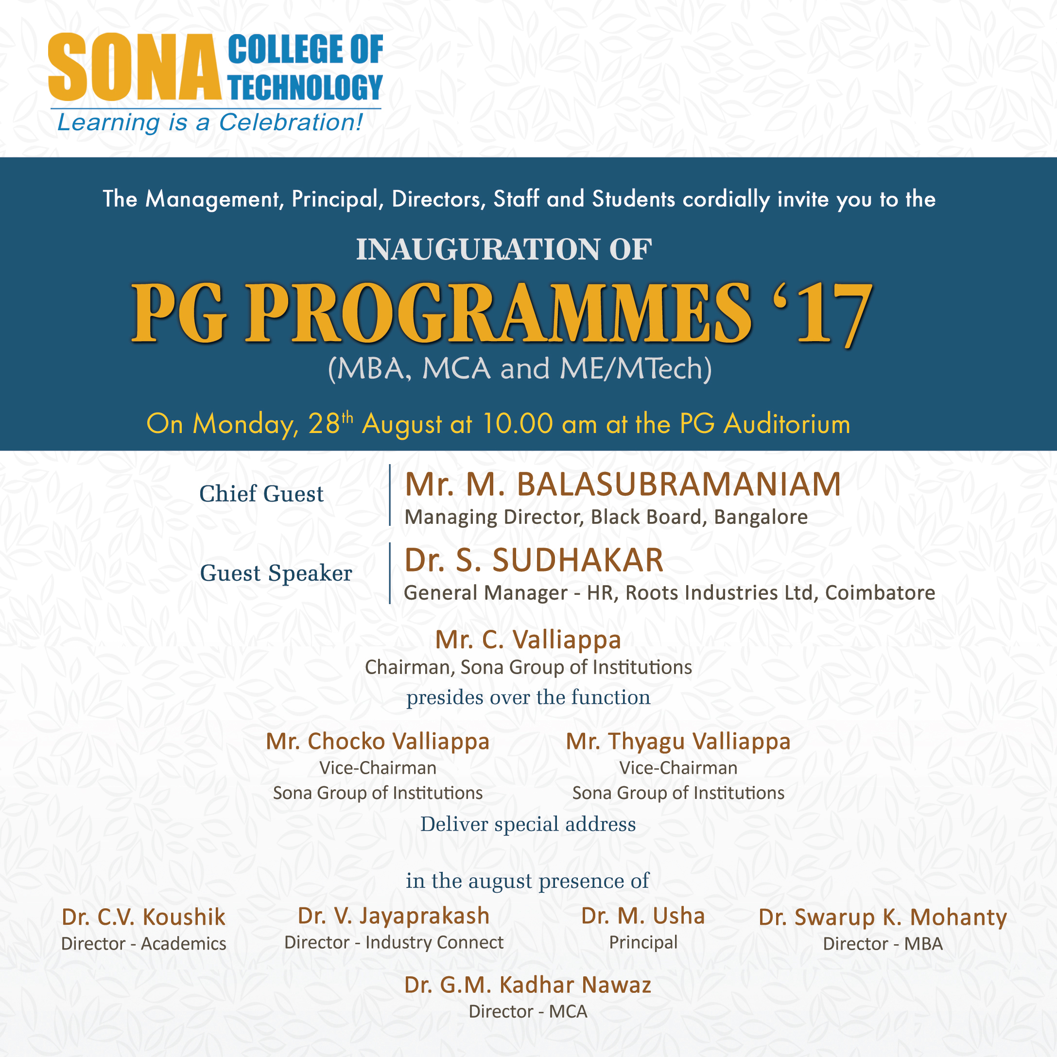 The Inauguration of PG PROGRAMMES’17 was held on Monday, 28th August at 10.00am in the PG auditorium. Mr.M.Balasubramaniam, Managing Director of Black Board in Bangalore and Dr.S.Sudhakar, General Manager (HR) Roots Industries ltd at Coimbatore were the chief guest and the guest speaker for the program. Dr.M.Usha, Principal of Sona College of Technology welcomed the gathering.