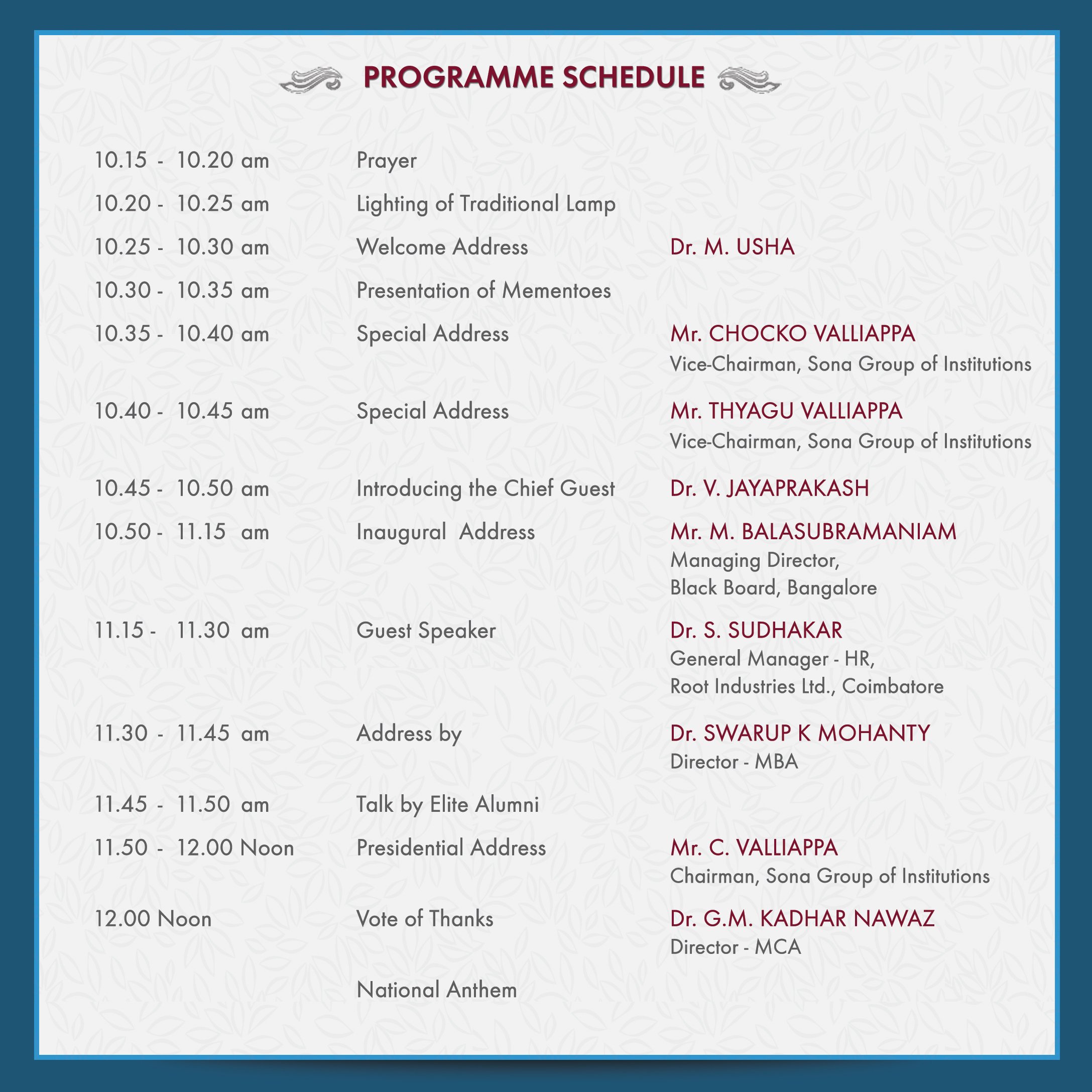 Then the special address was given by Dr.Swarup K Mohanty, Director, Sona School of Management. He spoke on what life skills one should have to deal with the VUCA world and briefed on Goal setting. He also shared his childhood experiences which made him strong and confident in his life. He beautifully explained the value of the word ‘HOPE’ with a short story about four candles. He is the first person to introduce virtual keyboard at the B-School in Tamil Nadu.