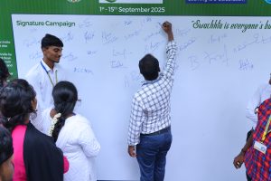 A 12 x 8 ft Signature Campaign banner titled “Swachhata is Everyone’s Business” was placed near the University Block. The event was inaugurated with the first signature by Principal Prof. Dr. S. R. R. Senthilkumar, joined by NSS Programme Officers Dr. P. Iyyanar and Mr. A. Naveen Kumar. Following this, students, faculty, and staff enthusiastically signed the banner, pledging their commitment to the cause. With over 300 participants, the completed banner now stands as a proud symbol of the community’s collective resolve toward cleanliness, hygiene, and civic duty.