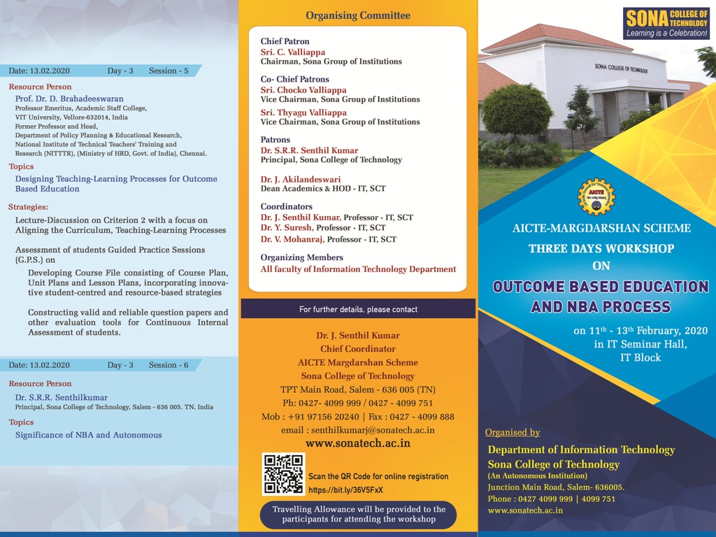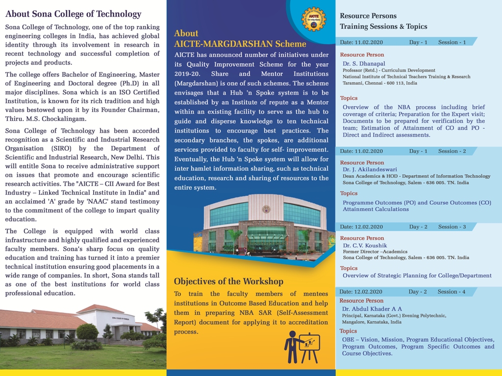 Department of IT is organising a Three Day Workshop on “Outcome based Education & NBA Process” under the AICTE – Margdharshan Scheme from 11.02.2020 to 13.02.2020 @ IT Seminar Hall, IT Block, Sona College of Technology, Salem.