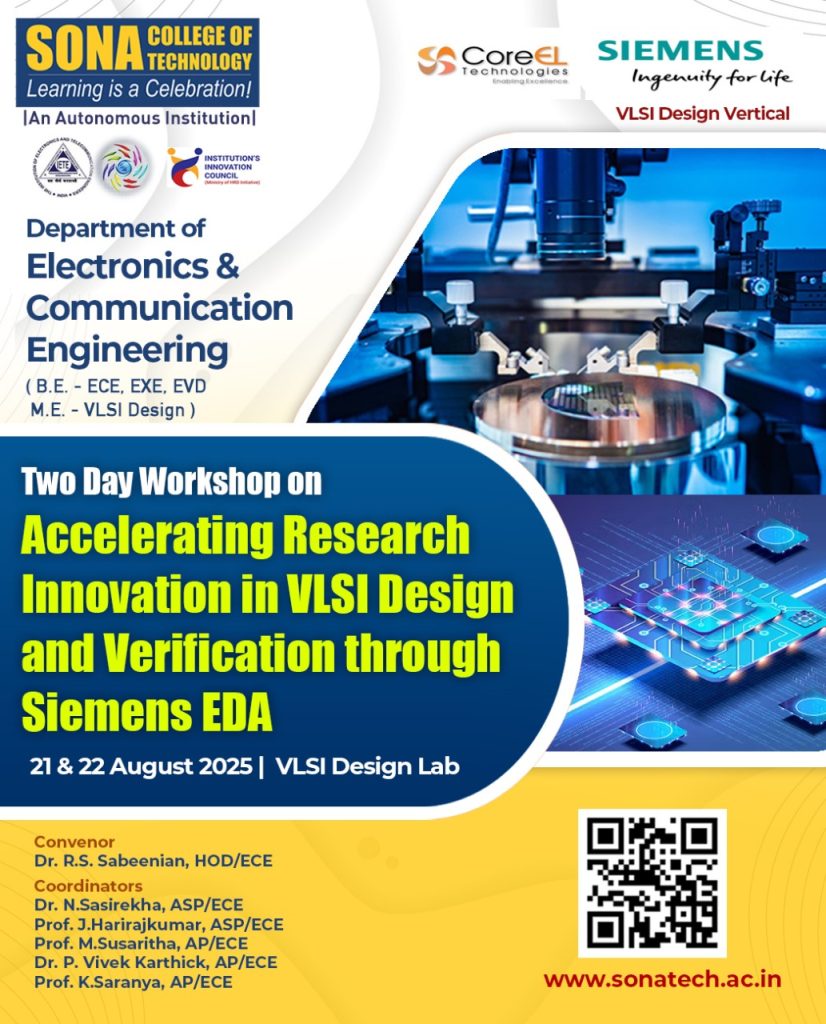 The Department of ECE organized a Two-Day Workshop titled “Accelerating Research Innovation in VLSI Design and Verification through Siemens EDA” on 21.08.2025 & 22.08.2025 in VLSI Design Lab, with Mr. G. Prakash, FAE at CG CoreEl, Bengaluru, as the resource person. He highlighted the significance of VLSI design and verification in today’s semiconductor industry and its applications across computing, communication, automotive, and IoT domains. The sessions focused on Siemens EDA tools, with hands-on demonstrations and case studies that bridged theory with real-world practices. He also emphasized global industry trends, the growing demand for skilled VLSI professionals, and opportunities in design, verification, and R&D. Students actively interacted with the speaker to clarify their queries on methodologies and career pathways. The workshop enriched participants with advanced knowledge and practical exposure. Overall, it proved highly beneficial, motivating students to explore VLSI research and career opportunities with industry readiness.