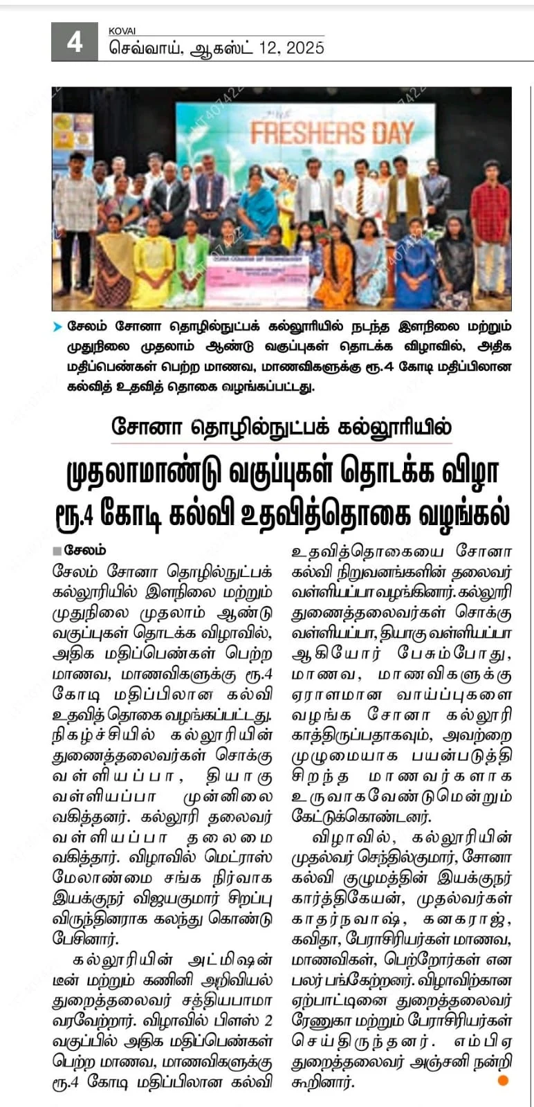 Sona College of Technology First-Year Inauguration – ₹4 Crore Scholarships Awarded