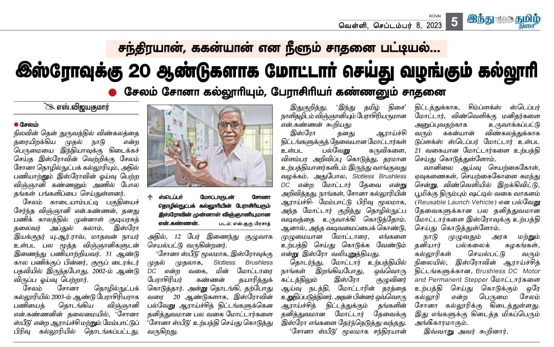 Sona College provides motors to ISRO for past 20 years - Tamil Hindu