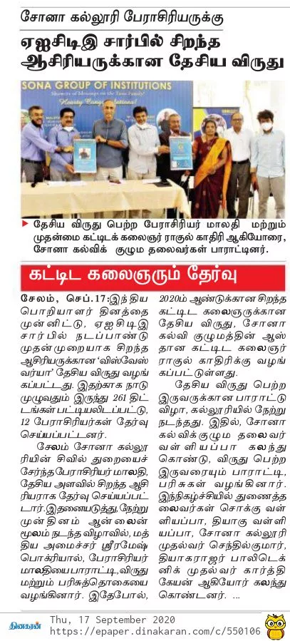 Sona College of Technology Dean R&D wins AICTE - Visvesvaraya Best Teacher Award.