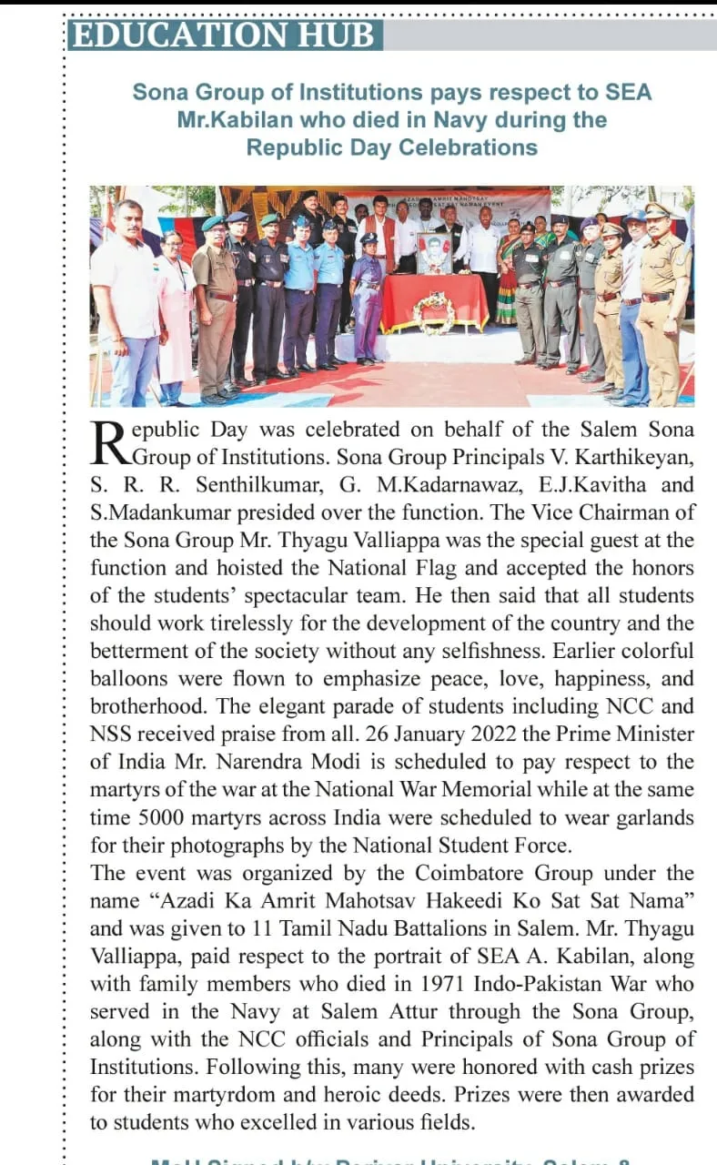 Sona Group of institutions pays respect to SEA Mr.Kabilan who died in Navy during the Republic Day Celebrations
