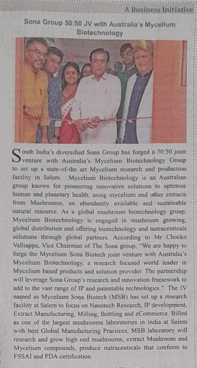 South India’s Sona Group 50:50 JV With Australia’s Mycelium Biotechnology
