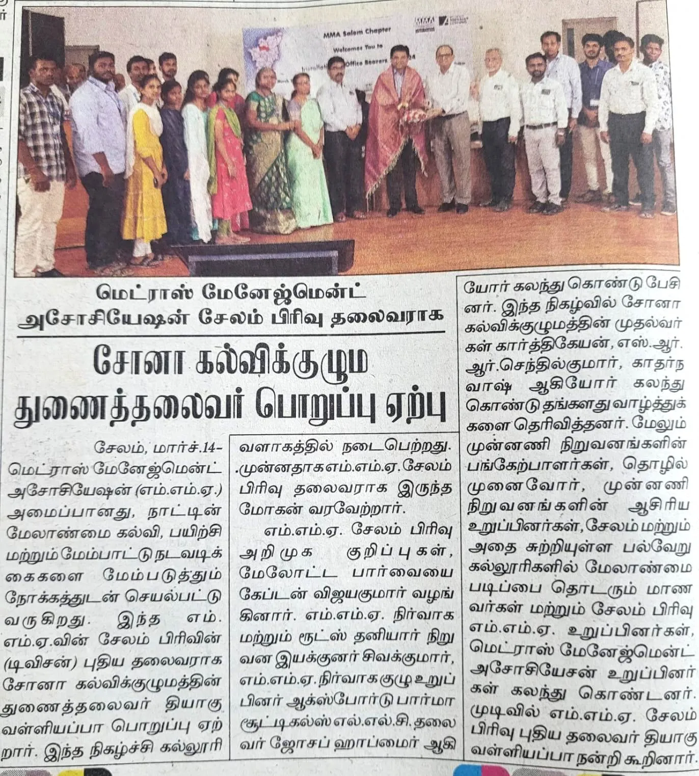 Sona college Vice chairman Thyagu Valliappa acceptance of responsibility as head of Madras Management Association - Salem Chapter