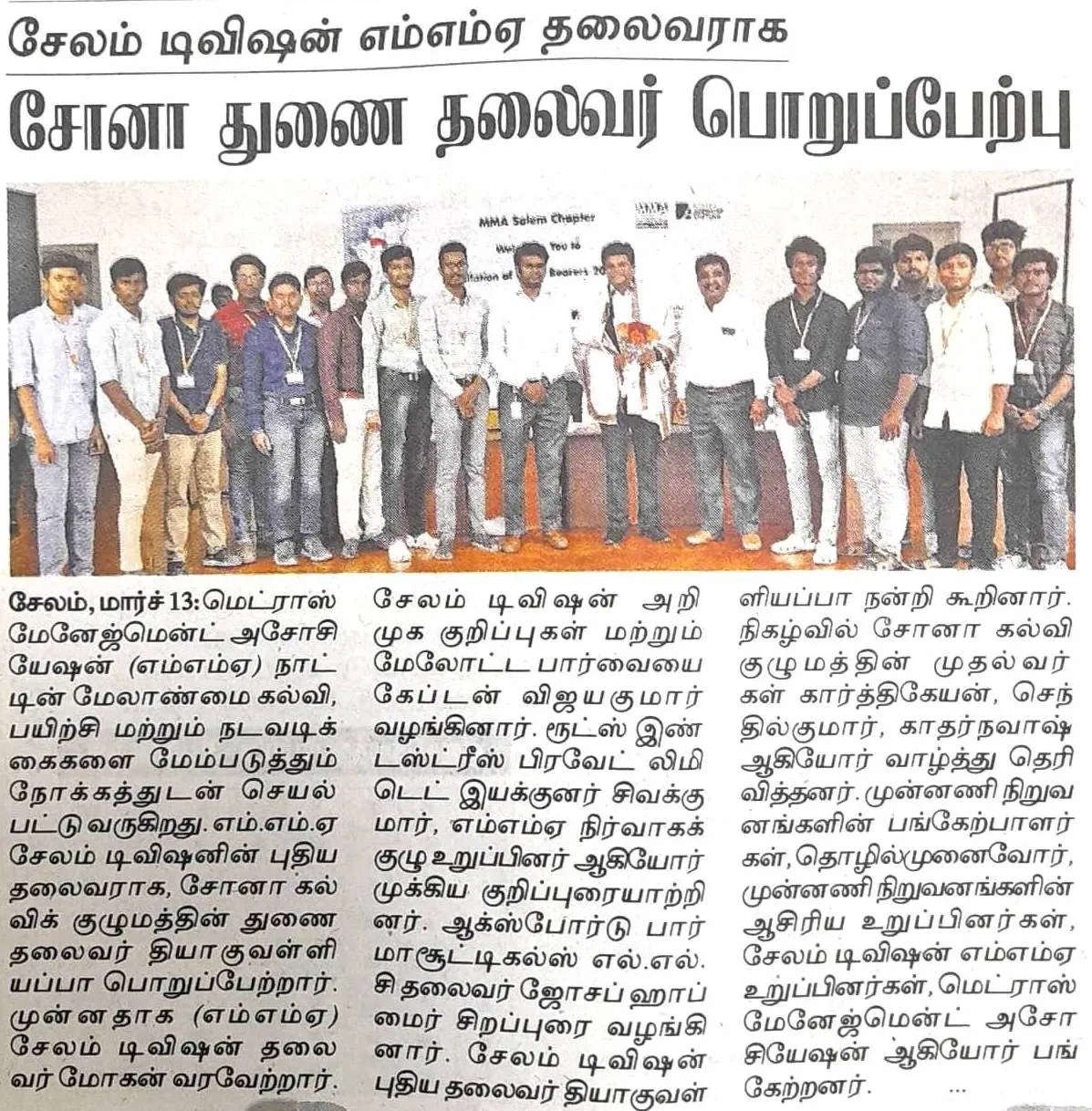 Sona college Vice chairman Thyagu Valliappa acceptance of responsibility as head of Madras Management Association - Salem Chapter