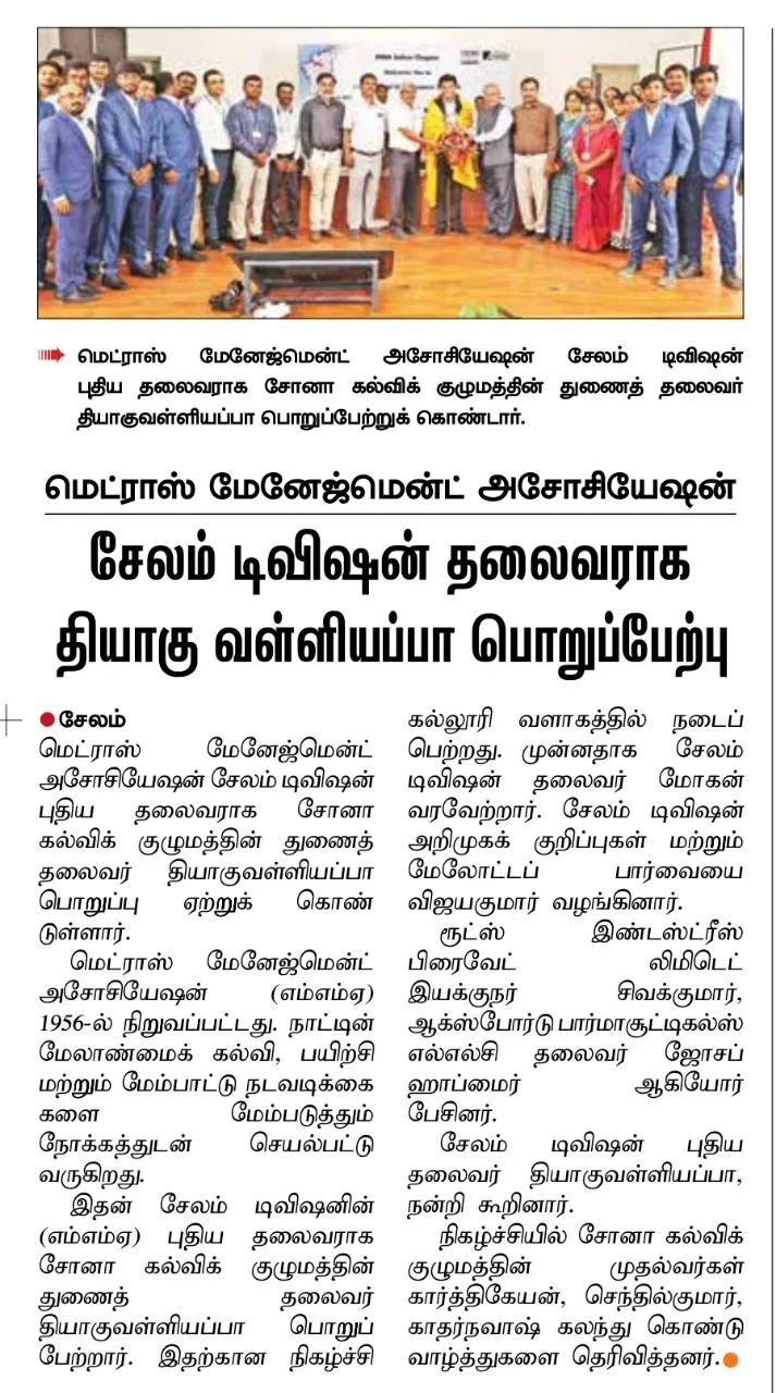 Sona college Vice chairman Thyagu Valliappa acceptance of responsibility as head of Madras Management Association - Salem Chapter